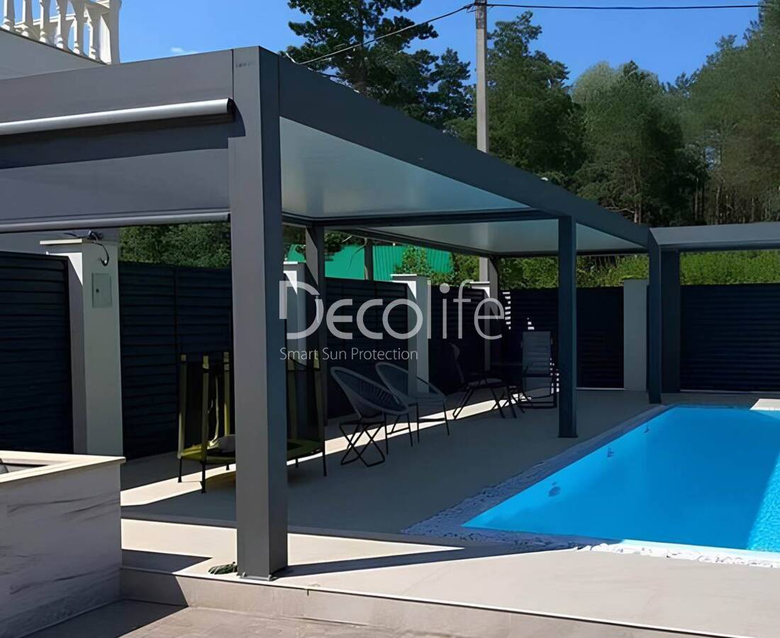 Пергола Decolife Bioclimatic B500-25П + Гильотинное W500 и Раздвижное S150 остекление + Стеклянное ограждение B50 - г. Браслав