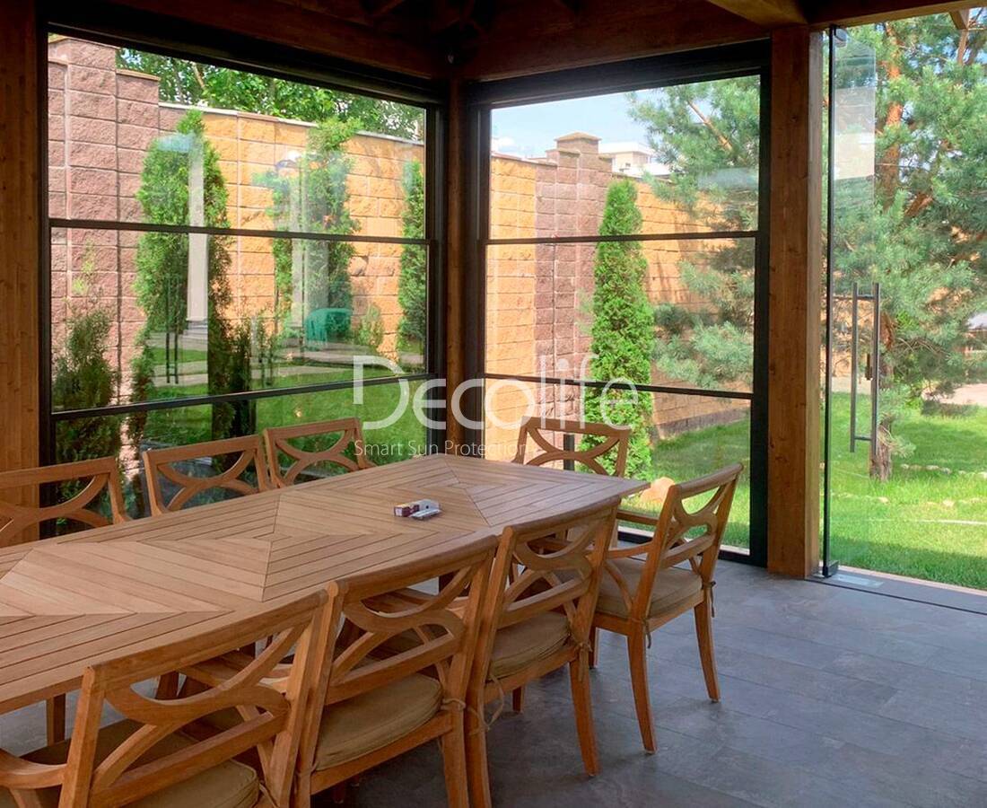 Остекление защищает от пыли, от ветра, от насекомых. Прочный алюминиевый каркас со временем не теряет физических свойств. Это помогает избежать деформации и затруднений при движении створок. Стекло также обладает особыми характеристиками в плане устойчивости к повреждениям, этим обусловлена долговечность систем. Конструкции зонируют площадку и превращают ее в зону комфортного отдыха.